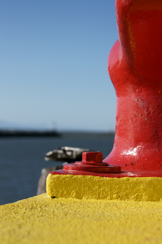 A marine bollard (used to tie up boats) from down low.